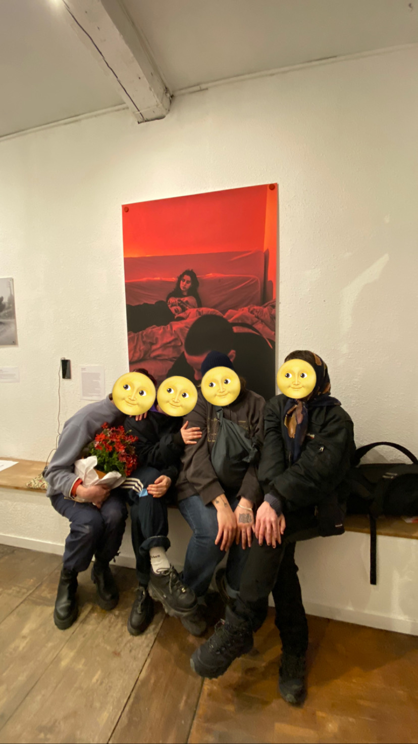 Par rapport aux souhaits de mon amie, une des protagonistes de la scène, les deux autres images qui composent la séquence dévoilent trop explicitement son visage pour être montré tel quel, figé sur une impression en grand format et montré à un ensemble d’inconnus.